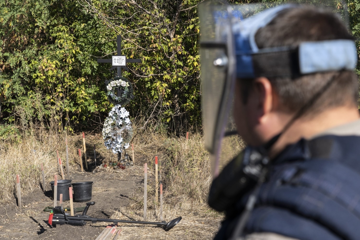 Збоку поля видніється хрест у вицвілих вінках. Біля нього цілий день працює один сапер. Це складна ділянка, де він працює переважно методом екскавації – шар за шаром знімає грунт, дістаючи осколки.