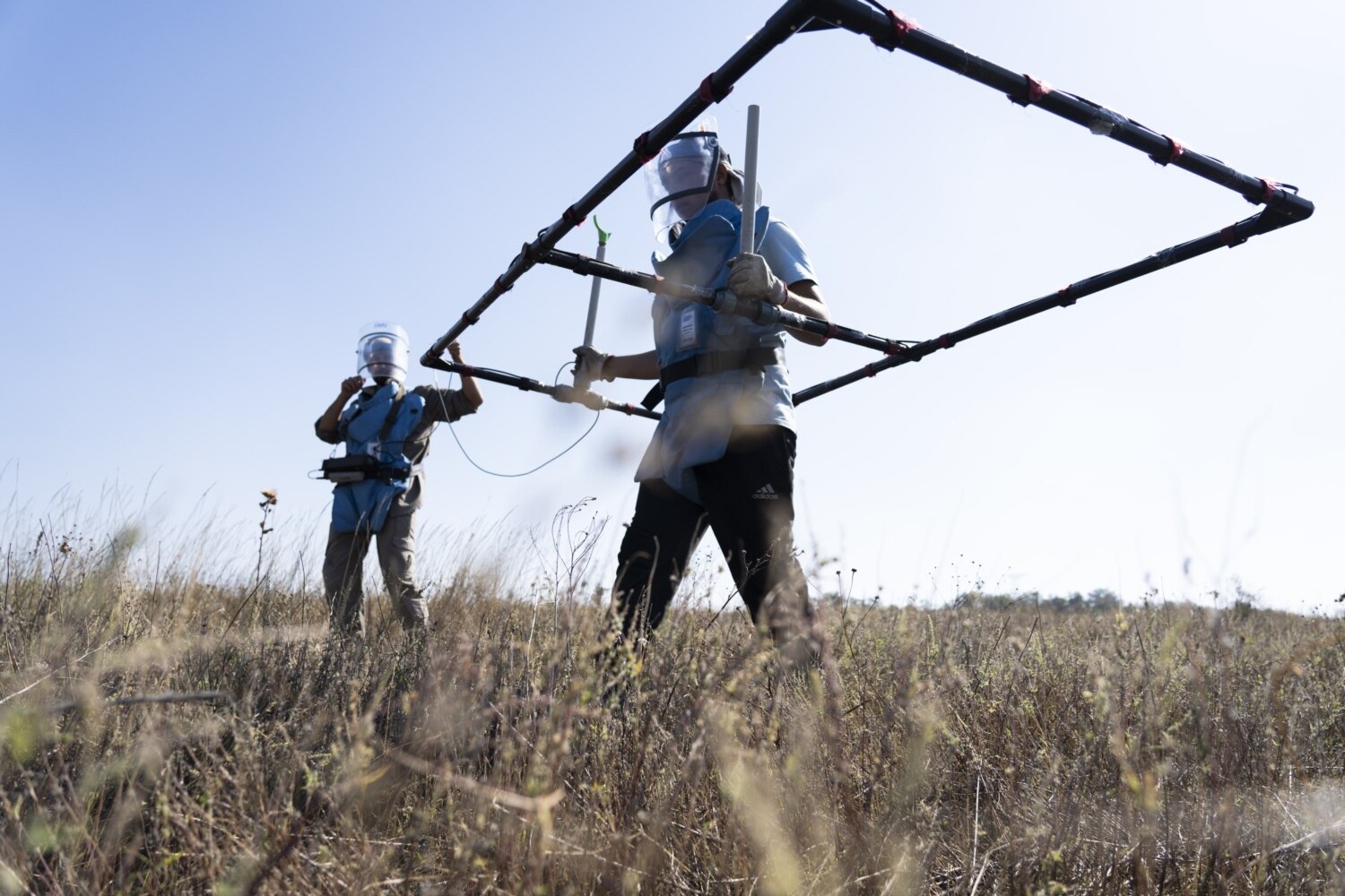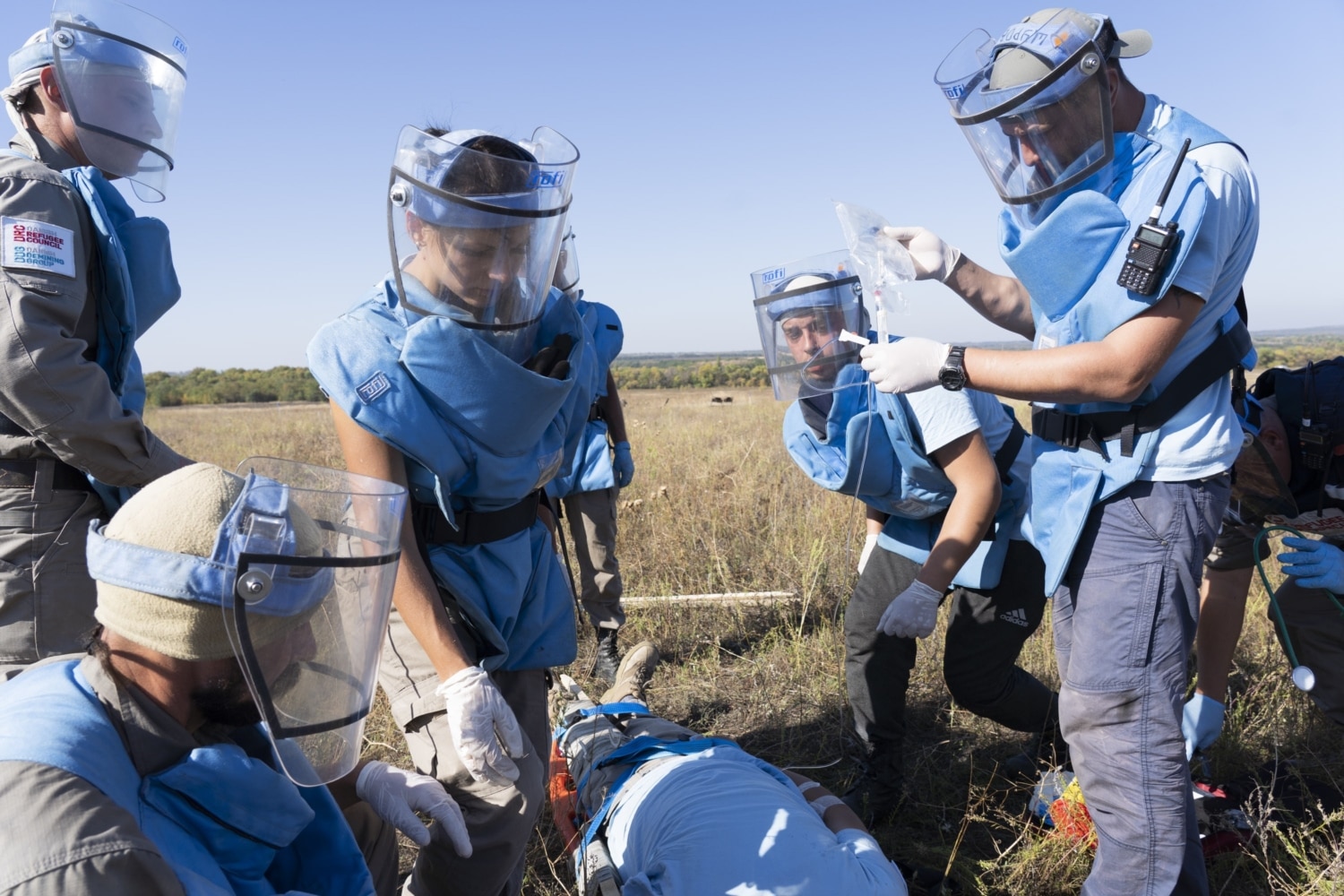 Затримати дрібні осколки від протипіхотної міни в разі вибуху мають кевларовий фартух та візор – те саме прозоре забрало на обличчі з двох шарів полікарбонату. Цей персональний захисний комплект вдягає кожен демінер перед початком роботи. Знімати будь-що можна лише тоді, коли пролунає свисток командира групи, що сповіщає про перерву.