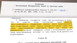«Вона (конвенція ‒ ред.) прямо передбачає право прибережної держави тимчасово припинити гарантоване конвенцією право на мирний прохід іноземних суден із урахуванням загрози безпеці цієї прибережної держави», ‒ пояснює голова комітету з морського права Асоціації адвокатів України Артем Волков.