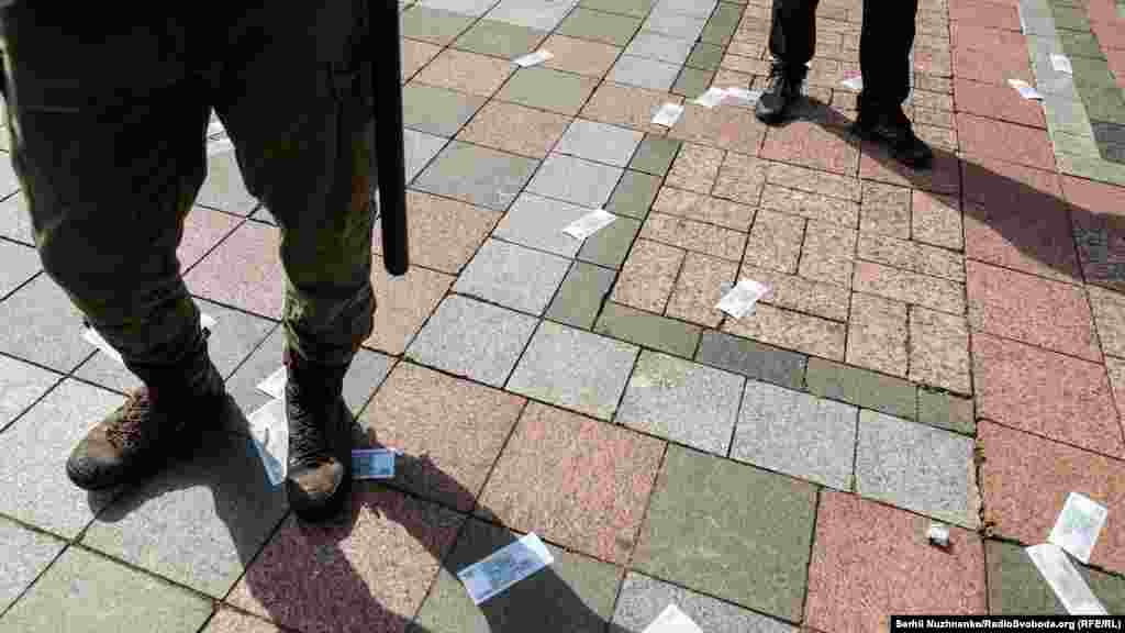 По закінченню акції правоохоронці намагалися скласти адмінпротокол про «порушення благоустрою» щодо активіста, який тримав кейс і розкидав «російські рублі»