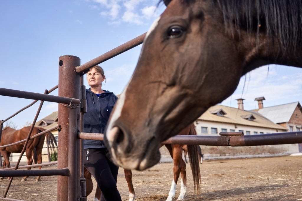 Біля наступного загону разом із кіньми нас біля загорожі зустрічає Світлана: вона «днювальна», доглядає за кіньми та стайнею – десь побілити, десь прибрати. Цікавимось – як працюється: «Та як...Ніяк. Без зарплатні. Січень нема, лютий нема, вересень нема – у борг виживаю». «А піти звідси не думали?» – питаємо, дізнавшись про її ставку – як і у багатьох навкруги вона мінімальна – менше 4-х тисяч гривень. «Та куди? – сміється. – Стайня і школа – більше нікуди!»
