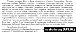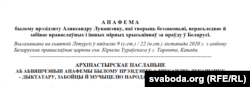 «Владою, даною нам від Бога, ми відлучаємо від Святої Православної Церкви і оголошуємо анафему колишньому президенту Олександру Лукашенку, хоча він носить християнське ім’я і належить до Православної Церкви лише за народженням, забороняємо йому таїнства Христові, згадувати його в православних богослужіннях і молитвах до повного каяття перед Церквою та білоруським народом», – йдеться в зверненні архиєпископа.