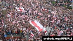 У центрі Мінська, де 23 серпня відбувається Марш нової Білорусі, за оцінками, зібралися понад 100 тисяч людей.