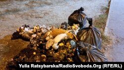 Зараз спалені іграшки зібрали у сміттєві пакети, вцілілі – залишили. Там також з’явився синьо-жовтий прапор, передає кореспондент Радіо Свобода.