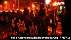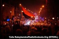 Як повідомляє кореспондент Радіо Свобода, кілька сотень учасників, представників громадських організацій під синьо-жовтими і червоно-чорними прапорами зі смолоскипами в руках пройшли центральною частиною міста від Парку ракет до пам’ятника Шевченку.