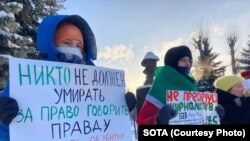 «Алсу Курмашева – журналістка, а не злочинниця», «Ніхто не повинен вмирати за право говорити правду», «Не переслідуйте журналістів» – такі плакати принесли на протест.