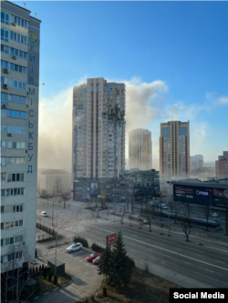 У ДСНС України уточнили: «26 лютого до ДСНС надійшла інформація, що по проспекту Лобановського, 6-А сталося попадання снаряду в багатоповерховий житловий будинок на рівні (18-21 поверхів). Пожежу ліквідовано, є загроза руйнування ж/б. Кількість постраждалих уточнюється. Ми оперативно будемо повідомляти про хід ліквідації наслідків цього воєнного злочину. А також просимо людей дотримуватись правил безпеки у разі оголошення повітряної тривоги.