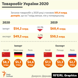 За 12 місяців 2020 року в Україну імпортували товарів на 54,2 млрд доларів (у порівнянні з 2019 роком імпорт зменшився на 6,2 млрд доларів). Експортували з України на 49,2 млрд доларів (зменшення експорту становило 0,85 млрд доларів). Відповідно, сальдо експорту-імпорту від’ємне – воно становило п’ять мільярдів доларів.