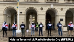 Білоруси, які зараз проживають у Львові, заспівали під час заходу національний гімн і розгорнули біло-червоно-білий прапор.