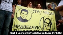Під стінами Генеральної прокуратури України зібралися декілька десятків людей під прапорами організації «Вільні люди». Вони скандують: «Медведчука під арешт».