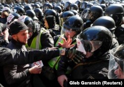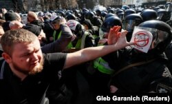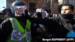 Як нагадали в МВС, у Києві правопорушники намагалися силою прорвати кордон поліцейських, застосували газ дратівливої дії і піротехніку. Правоохоронці були змушені застосувати у відповідь фізичну силу і спецзасоби. Під час сутичок потерпіли двоє правоохоронців. (Раніше поліція Києва повідомляла про трьох потерпілих силовиків – двох поліцейських і одного нацгвардійця – ред.)