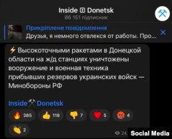 «Високоточними ракетами у Донецькій області на залізничних станціях знищені озброєння і військова техніка резервів українських військ, що прибули», – зазначалось у пості, який досі можна знайти у цьому Telegram-каналі.