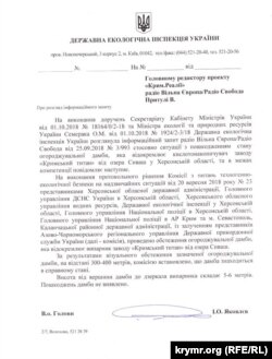 Державна екологічна інспекція України стверджує, що здійснила перевірку дамби, яка відділяє кислотонакопичувач заводу «Кримський титан» від озера Сиваш, з боку Херсонської області. Як йдеться у відповіді на запит проекту Радіо Свобода «Крим.Реалії», руйнувань на дамбі не виявили.