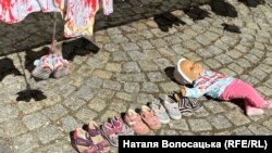 До посольства України у Варшаві мітингарі принесли закривавлений дитячий одяг і взуття як символ вбивств, які відбулися на Волині.