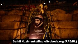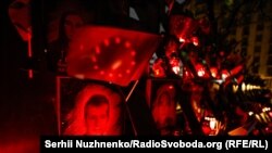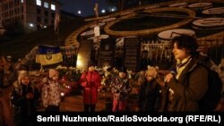 Ввечері на майдані Незалежності зібралася невелика кількість людей, щоб згадати, як розпочиналася Революція Гідності, серед них був співак і громадський діяч Святослав Вакарчук, один із голосів обох Майданів.