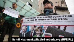 Біля посольства Німеччини в Києві 11 квітня відбувся пікет «Ні – скасуванню європейських санкцій проти Росії». Акцію організувало Об’єднання родичів політв’язнів Кремля, повідомляє кореспондент Радіо Свобода.