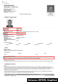 Михайло Воєводін, згідно з інформацією з Інтерполу, має статус так званого «злодія в законі». Свідчить про це документ, який є у розпорядженні «Схем». У картці Інтерполу вказаний його нікнейм – «Misha Luzhnetskiy».