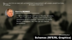 «Ви ж розумієте, що гроші пішли, продані, сп***жені і так далі. Треба знаходити інші джерела фінансування і причому їх треба якось узаконити. Як? Ми ще не зовсім розуміємо», – каже голос, схожий на голос Миколи Божка, керівника «Атомпроектінжинірингу», відокремленого підрозділу «Енергоатому», який виступає замовником будівництва від держави.