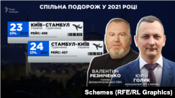 Разом Голик та Резніченко також відвідували Стамбул, полетівши туди одним рейсом 23 січня 2021-го і разом повернувшись наступного дня – 24 січня, проходячи паспортний контроль в Борисполі один за одним.