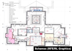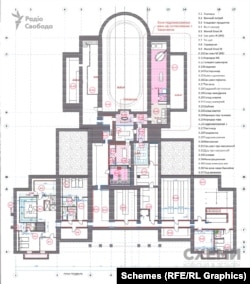 Відео, зняте журналістами вже у листопаді, зафіксувало суттєвий прогрес у ремонтних роботах. Додатково «Схеми» отримали у своє розпорядження креслення – плани повної реконструкції та перепланування палацу Медведчука площею більше двох тисяч квадратних метрів. Згідно з цими документами, приміщення тут відведені, зокрема, під шубосховище, сервізну, склади картин та суконь, секретну кімнату тощо. Медведчук на запит журналістів не відповів.