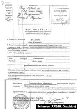 Заступник керівника Офісу президента Олег Татаров у розпал Революції гідності отримав звання «Заслужений юрист України» від Віктора Януковича за особистим поданням тодішнього міністра внутрішніх справ Віталія Захарченка – «за впровадження в життя рішень президента, Верховної Ради та Кабінету Міністрів, спрямовуючи зусилля підлеглих працівників на посилення боротьби зі злочинністю та зміцнення правопорядку в державі». На момент нагородження Татаров обіймав посаду заступника керівника Головного слідчого управління МВС і регулярно публічно коментував події на Майдані, розповсюджуючи звинувачення на адресу активістів. Про це повідомляють журналісти програми «Схеми», які отримали ці документи у своє розпорядження.