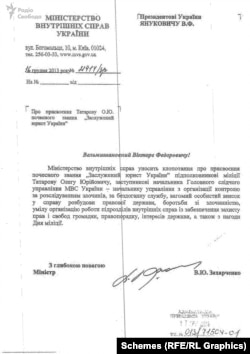Подання щодо нагородження Олега Татарова на ім’я тодішнього президента Віктора Януковича Віталій Захарченко вніс 16 грудня 2013 року.