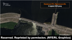 Проєкт Радіо Свобода «Схеми» опублікував перший супутниковий знімок Planet Labs за 6 червня, на якому видно наслідки підриву Каховської гідроелектростанції.