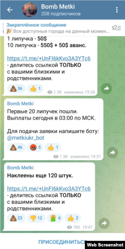 В іншому Telegram-каналі під назвою Bomb Metki також пропонують грошову винагороду за розміщення наліпок в Україні. При цьому робота координується за московським часом. Там відзвітували про 120 розклеєних міток в різних регіонах України.