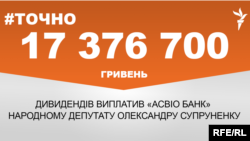 Народний депутат України Олександр Супруненко у липні отримав 17 376 700 гривень дивідендів від «Асвіо Банку». Така інформація міститься у Єдиному державному реєстрі декларацій осіб, уповноважених на виконання функцій держави або місцевого самоврядування, повідомляє #Точно, проект Радіо Свобода.