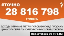 Президент України Петро Порошенко продав цінні папери та корпоративні права у жовтні на суму 28 816 798 гривень. Така інформація міститься в Єдиному державному реєстрі декларацій осіб, уповноважених на виконання функцій держави або місцевого самоврядування, повідомляє #Точно, проект Радіо Свобода.