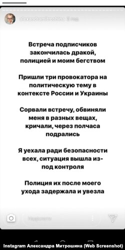 Тим часом Олександра Мітрошина, яка проводила в Києві «зустріч із підписниками», назвала провокаторами активістів «Відсічі», які запитали в неї: «Чий Крим?» Як написала вона в інстаґрамі, після «зриву» її виступу вона втекла. «Прийшли три провокатори на політичну тему в контексті Росії й України. Зірвали зустріч, звинувачували мене в різних речах, кричали, через півгодини побилися», – написала вона. Блогерка також вибачилася перед підписниками, які прийшли.