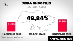 Активність виборців на позачергових парламентських виборах станом на 20:00 склала 49,84%, повідомляє Центральна виборча комісія. Ці дані базуються на даних з усіх 199 виборчих округів.