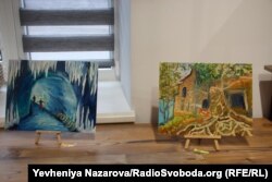 «Маслом 12 картин представлено. Ми спробували методом тику, що цікаво, що вийде. Коли спробували, то виявилось, що може малювати дитина. І тепер більш ніж два роки малюємо», – розповіла Олена, мати однієї з авторів виставки Дарії Уйгуноски.
