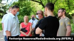 До акції долучилися його знайомі та військові побратими, які принесли з собою портрети загиблого. Вони протестують перегляду запобіжного заходу підозрюваним у вбивстві Олешка.