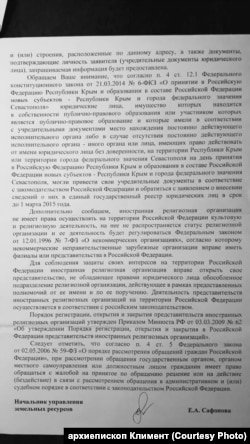 «На мої запити до Аксьонова (російського «глави Криму» Сергія – ред.) повдіомили, що міністерство майнових та земельних відносин Криму не знає, кому належить ця земля, і вона належить місту. А місто дало відповідь, що вони не скажуть, кому саме вони віддали земельну ділянку, тому що це суперечить російському законодавству. А я маю довести що ця земельна ділянка належить мені», – каже голова єпархії.