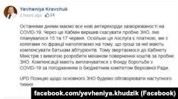 Далі ж у первісній версії допису мовилося: «Крім того, з’явилися тривожні сигнали про можливе повне скасування зовнішнього незалежного оцінювання. Про це пише освітній омбудсмен Сергій Горбачов. Ця інформація офіційно поки не підтверджена, проте ми хочемо наголосити: скасування основної сесії ЗНО є неприпустимим, інакше є ризик повернутися до корупції і хабарництва в університетах. ЗНО – це про рівний і справедливий доступ талановитої молоді до вищої освіти. Це про однакові шанси вступити до найпрестижніших університетів завдяки знанням, а не хабарю за екзамен. Тому ми застерігаємо утриматись від ухвалення такого рішення і забезпечити проведення основної сесії ЗНО у безпечних умовах».
