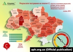 Всього у 26 містах всіх областей України (окрім окупованих територій) було протестовано 3 844 людини, у 324 випадках (8,5%) експрес-тест показав наявність антитіл до вірусного гепатиту С.
