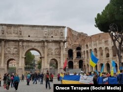Як повідомляє кореспондент Радіо Свобода, під стінами Колізею та біля арки Костянтина зібралися півсотні активістів української спільноти з антивоєнними гаслами й національною символікою.