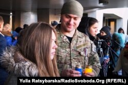 На урочисту зустріч вогню під будівлею міської ради зібралось близько сотні людей, зокрема ветерани антитерористичної операції проти спільних російсько-сепаратистських сил на окупованій частині Донбасу.