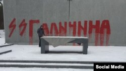 Як виглядає із розміщених В’ятровичем світлин, невідомі залишили на бетонних плитах меморіалу написи червоною фарбою «СС Галичина», «ОУН-УПА» та лайливі слова польською мовою.