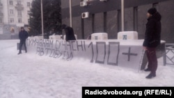 Активісти розгорнули перед будівлею міської ради великий плакат з написом «Сумчанам сучасні автобуси 100+» та передали письмові звернення для міського голови Олександра Лисенка щодо необхідності закупівлі автобусів для перевезення пасажирів у Сумах.