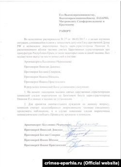 «На виконання розпорядження № 27 від 06.03.2017 року, з метою вивчення ситуації, що склалася у зв’язку із заявою депутата Державної думи Росії про можливе мироточення бюста царя-страстотерпця Миколи II, розташованого поблизу каплиці святих Царствених страстотерпців при прокуратурі республіки Крим, а також деяких ікон в самій каплиці, був здійснений виїзд на місце комісією», – йдеться в рапорті.
