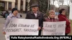 «Проведення тендерів на закупівлю спеціального розчину для діалізу ставить хворих в жахливі умови. Проведення тендеру затягується з лютого, а вже на четвертий день без діалізу люди погано себе почувають», – сказала координаторка акції Світлана.