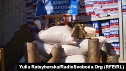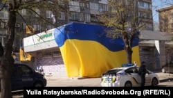 Як повідомляє кореспондент Радіо Свобода, вони обгорнули будівлю банку великим синьо-жовтим полотнищем і прикріпили на фасаді плакат із написом «Російські банки – геть!».