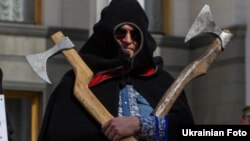 Активісти, одягнуті як «кати» із символікою парламентських фракцій, встановили під будівлею Верховної Ради шибеницю з написом «законопроект № 6220».