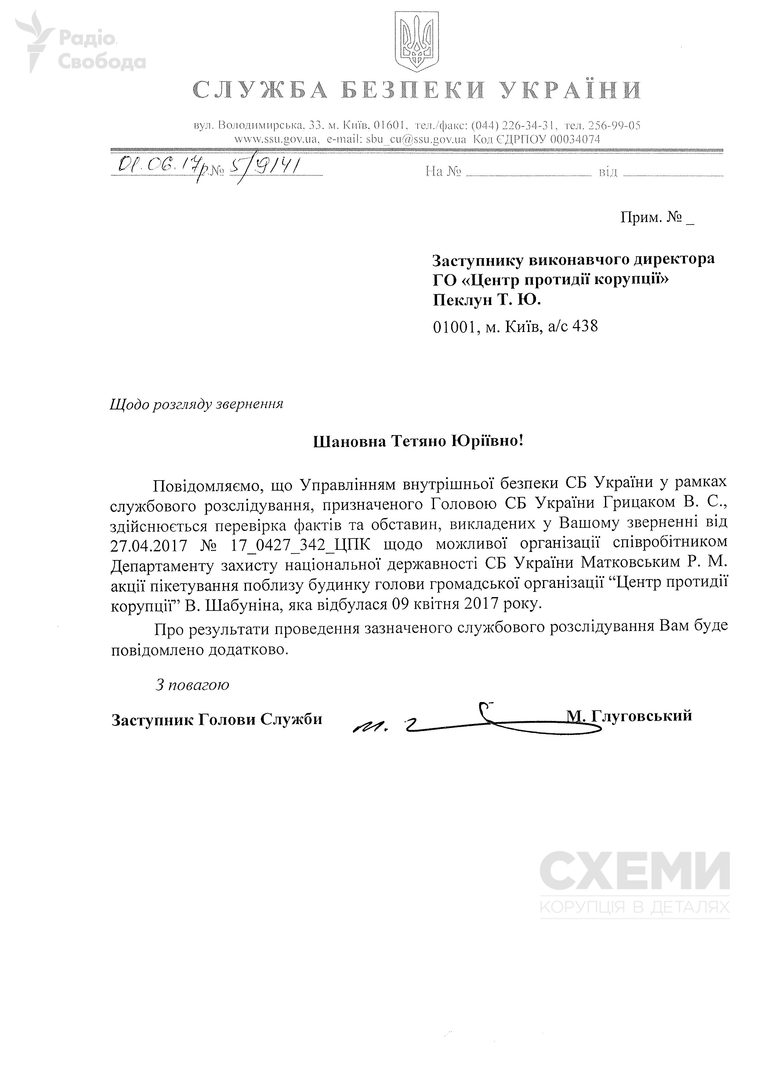 «Управлінням внутрішньої безпеки здійснюється перевірка фактів та обставин (...) щодо можливої організації (...) Матковським Р.М. акції пікетування поблизу будинку Шабуніна В. 9 квітня», – написав заступник голови СБУ Михайло Глуговський у відповідь на звернення юристів «Центру протидії корупції».