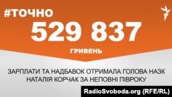 Зокрема, за січень Наталія Корчак отримала заробітну плату у сумі 66138 гривень, за лютий – 81627 гривень, за березень – 70496 гривень, за квітень – 81627 гривень та за травень – 84431 гривню. Розмір заробітної плати за першу половину червня склав 40800 гривень.