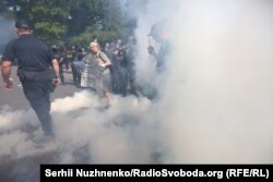 Крім того, на вулиці Грушевського деякі учасники з символікою «Національного корпусу» мітингу кинув димову шашку. У прес-службі Національного корпусу підтвердили, що активісти палять фаєри.