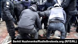 «Близько 11:00 біля стін Верховної Ради України мітингувальники підпалили принесені ними п’ять автомобільних шин. Поліція роз’яснювала учасникам акції неправомірність їхньої поведінки в частині підпалення шин, а працівники ДСНС намагалися загасити підпалені предмети. У цей час мітингувальники застосували сльозогінний газ в бік правоохоронців, почали кидати бруківку, покришки та інші сторонні предмети», – повідомили в поліції.