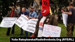 Поряд з опудалом активісти розгорнули плакати з написами «Геть російських окупантів та їхніх посіпак!», «За роки Другої світової війни було спалено більше 670 українських сіл» тощо.